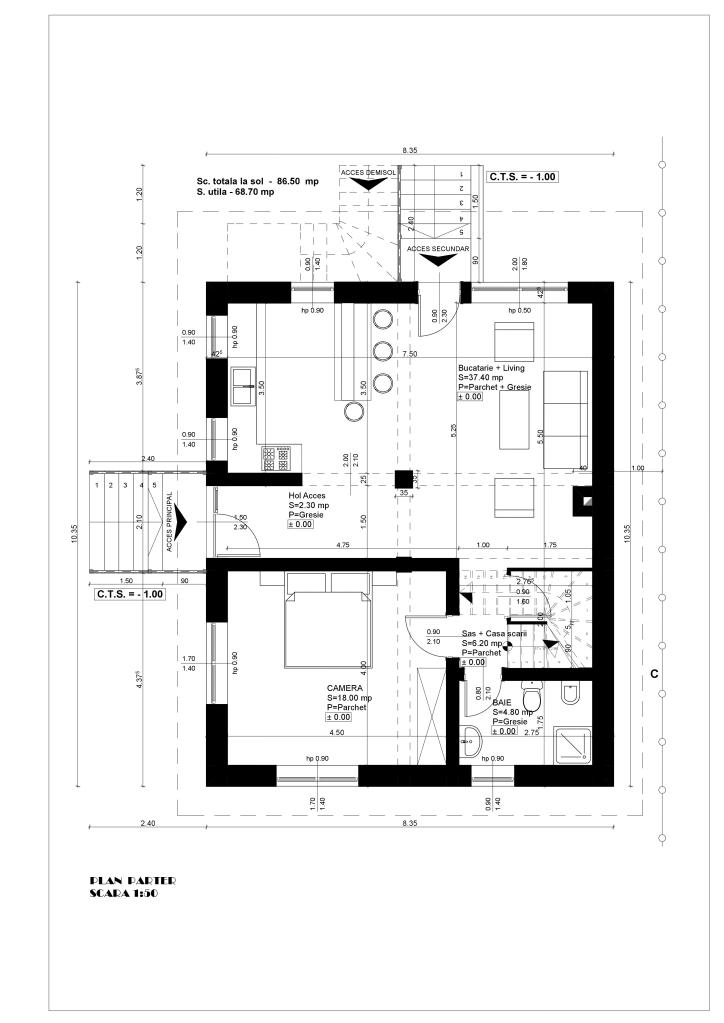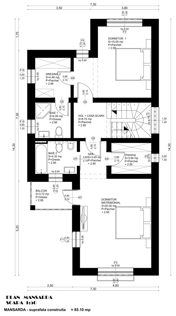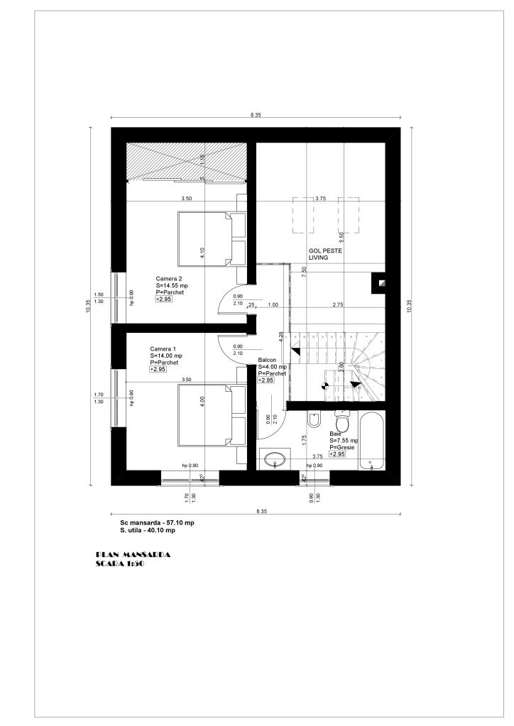 - Casa Demisol + Parter + Mansarda – suprafata construita la sol de 86.50 mp si suprafata desfasurata de 197.95 mp, casa are o suprafata utila totala de 150.90 mp.
