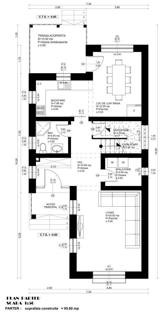 - Casa Parter + Mansarda – suprafata construita la sol de 124.85 mp si suprafata desfasurata de 240.85 mp, casa are o suprafata utila totala de 188.55 mp. Locuinta executata in Mun. Arad. – participare la expozitia