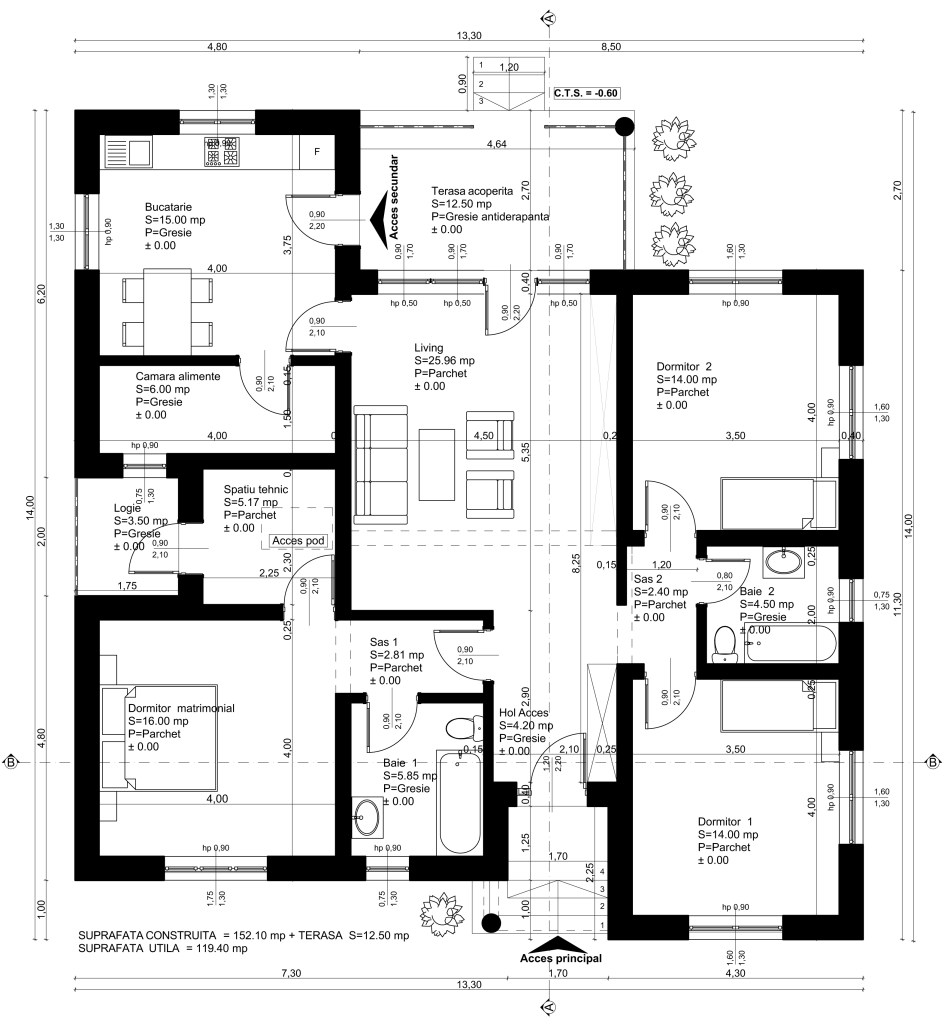 Casa Parter CR01 – suprafata construita la sol de 152.10 mp + terasa, casa are o suprafata utila totala de 119.40 mp. Locuinta executata in Mun. Arad. – in anul 2018, in curs de finalizare